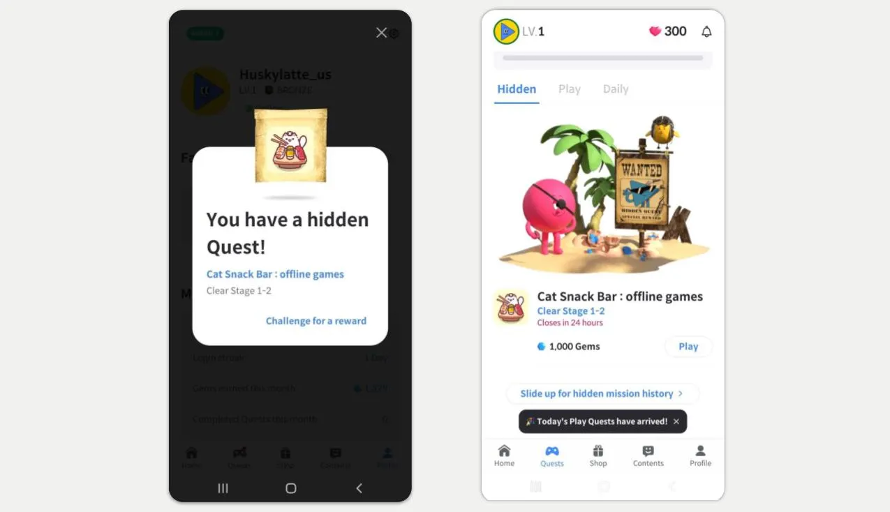 Hidden Quests encourages user actions, including sign-ups, in-app purchases, and ad views, up to any in-game event needed for optimization.